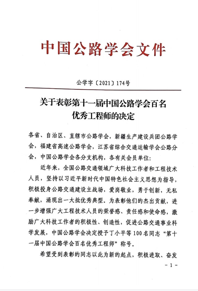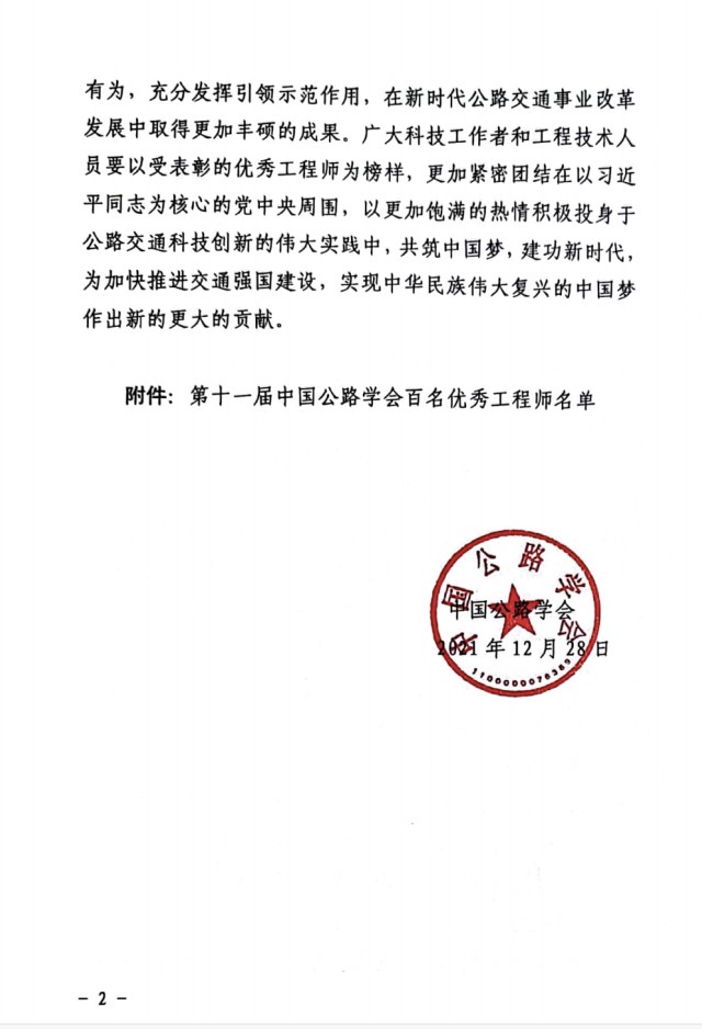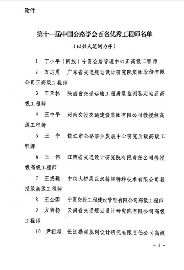 日前,中国公路学会组织评选的“第十一届中国公路学会百名优秀工程师”结果揭晓,公司张海斌同志荣登此榜。 中国公路学会对爱岗敬业、勇于创新、无私奉献的公路交通科技工作者和工程技术人员进行反复甄选评比,最终评选出公路交通建设领域内百名优秀工程师。