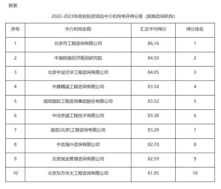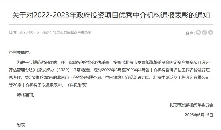 2023年6月16日,北京市发展和改革委员会发布了“2022-2023年政府投资项目优秀中介机构”通报表彰的通知,北京市发改委经对2022年5月至2023年4月各中介机构咨询评估工作评价进行汇总考评,决定对排名靠前的20家中介机构予以通报表彰,北京价源技术有限公司(原北京逸群工程技术有限公司)在本次考评中获通报表彰。